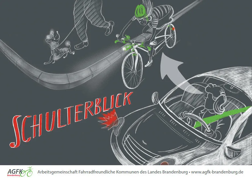 Dabei sollen die Verkehrsteilnehmer durch Plakate aber auch durch Aktionen in Mitgliedskommunen der AGFK auf die Wichtigkeit des Schulterblicks sowie die Einhaltung eines ausreichenden Überholabstandes hingewiesen werden. Die beiden Plakatmotive der Illustratorin Anna Maria Eisen orientieren sich in der Gestaltung an Schultafelzeichnungen, mit denen ein spezifisches, wieder erkennbares Layout erreicht werden soll.