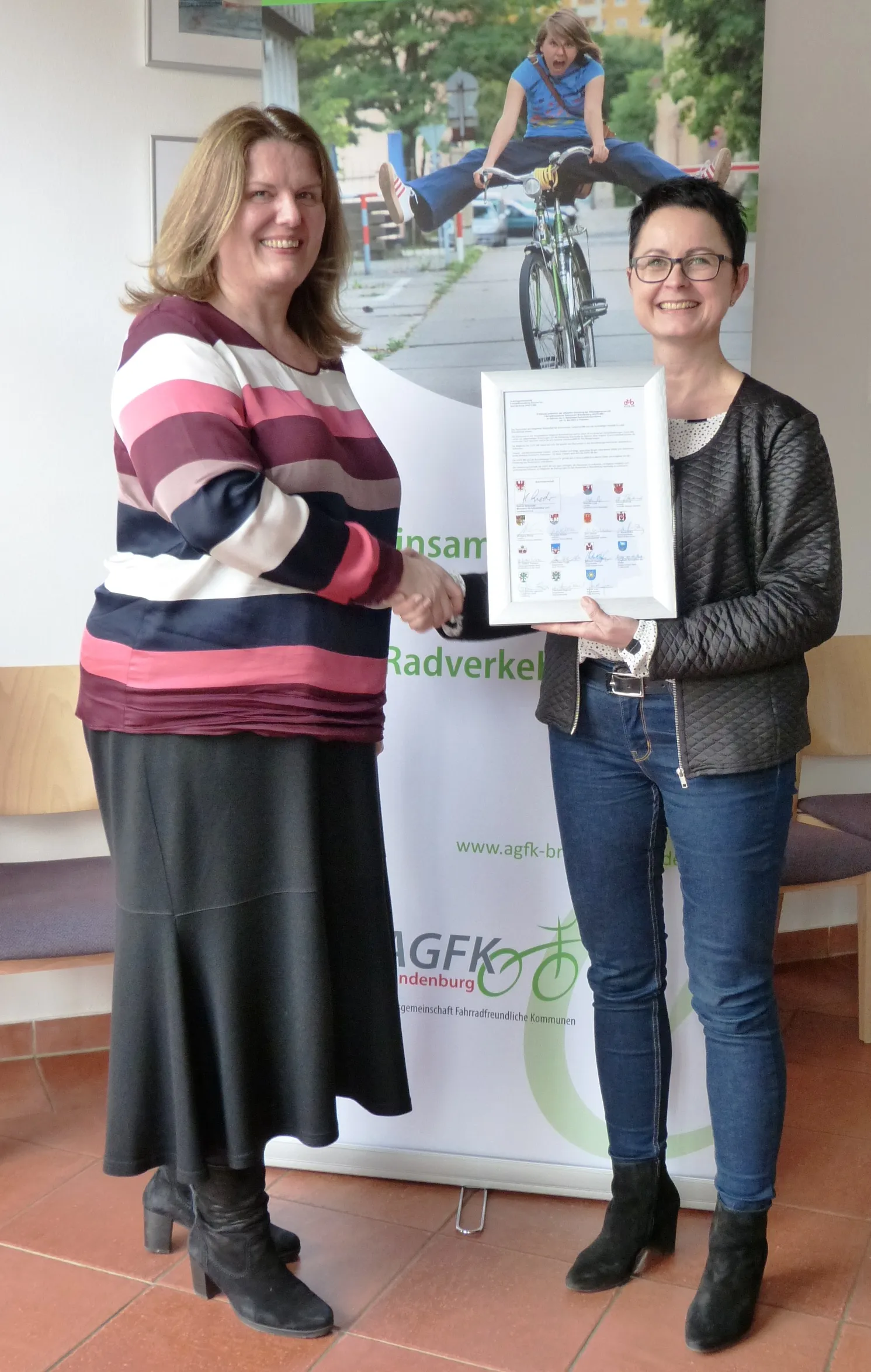 Die Vorsitzende der AGFK BB, Frau Jura, übergibt die Mitgliedsurkunde an Frau Rietz, 1. Beigeordnete der Stadt Teltow. Foto: Jeschke (AGFK BB / IPG)