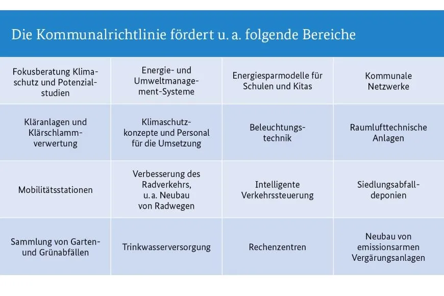 Förderanträge können das ganze Jahr über beim Projektträger Jülich (PtJ) eingereicht werden. Der Mindestzuwendungsbetrag für Mobilitätsstationen und Maßnahmen zur Verbesserung des Radverkehrs beträgt nur noch 5.000 Euro. Die Höchstzuwendungsbeträge entfallen für Mobilitätsstationen, Vorhaben zur Verbesserung des Radverkehrs sowie Maßnahmen zur Deponiegasfassung und in-situ-Stabilisierung von Siedlungsabfalldeponien. Im Rahmen der Fokusberatung können neben Maßnahmen, die über die Kommunalrichtlinie gefördert werden, auch andere wirkungsvolle Instrumente zur Reduzierung von Treibhausgasen eingesetzt werden. Dazu zählen beispielsweise Maßnahmen, die grundsätzlich über Bundes- oder Landesprogramme förderfähig sind.