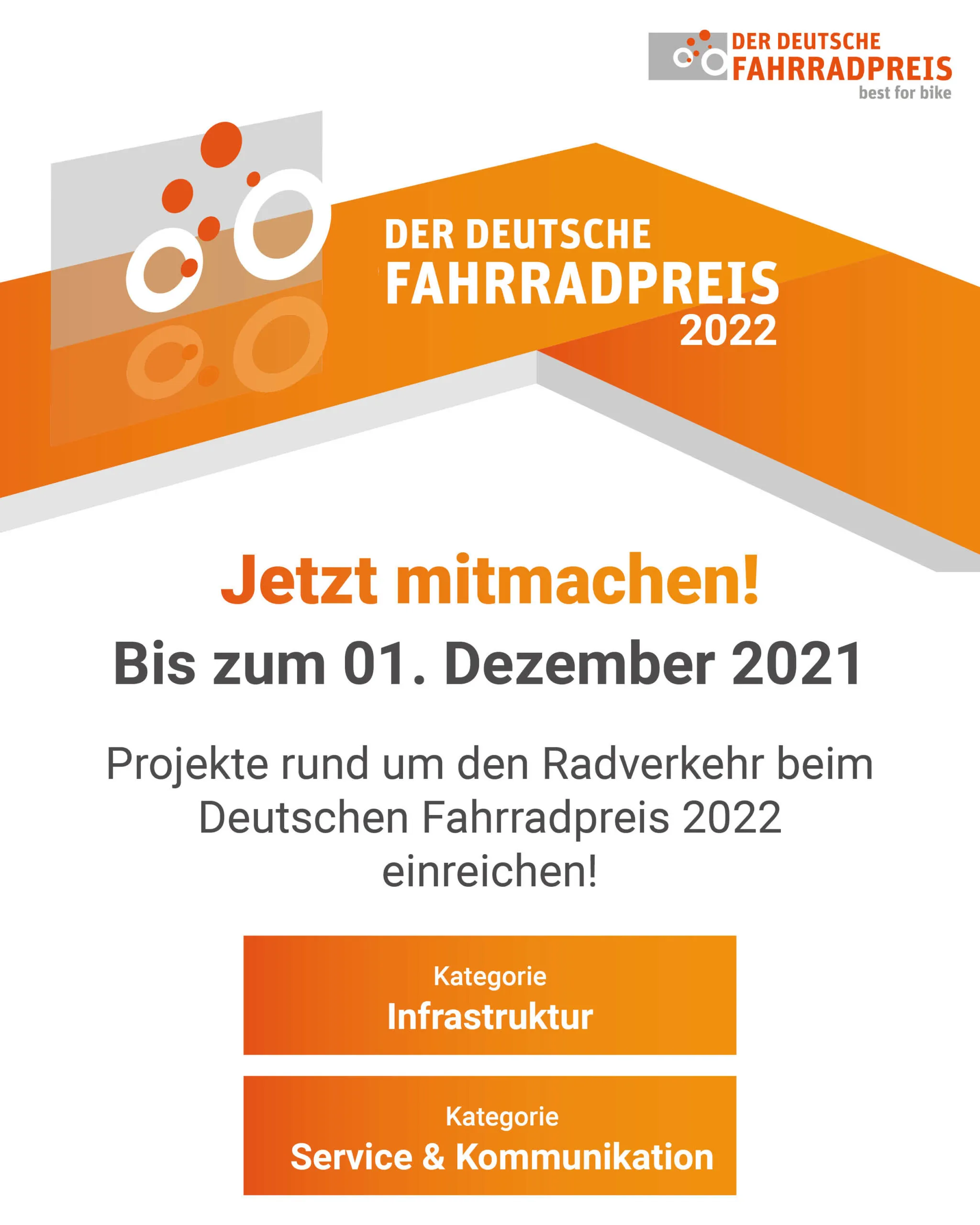 Bis zum 01. Dezember 2021 können Sie innovative Projekte der Radverkehrsförderung beim Deutschen Fahrradpreis einreichen. Ausgezeichnet werden Projekte in den zwei Kategorien Infrastruktur und Service & Kommunikation. Der Wettbewerb ist mit insgesamt 19.000 Euro dotiert.