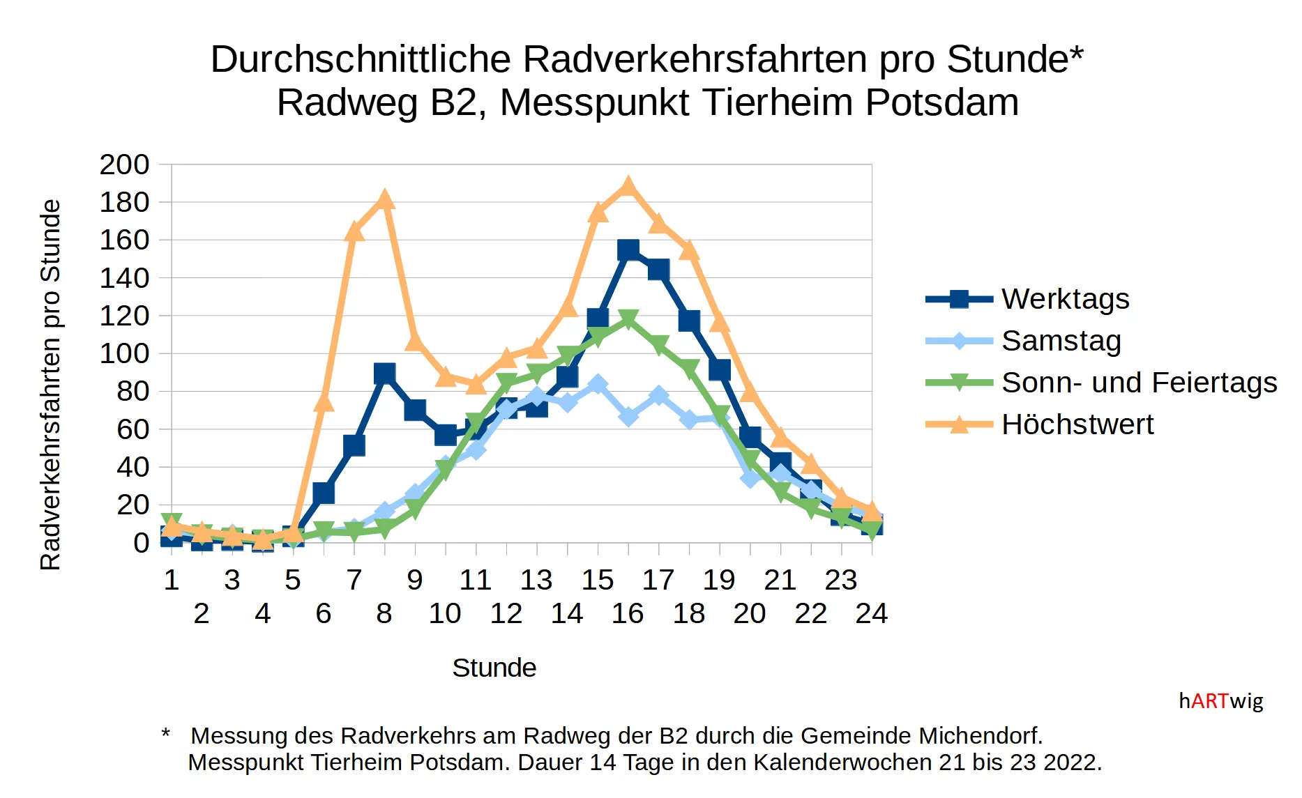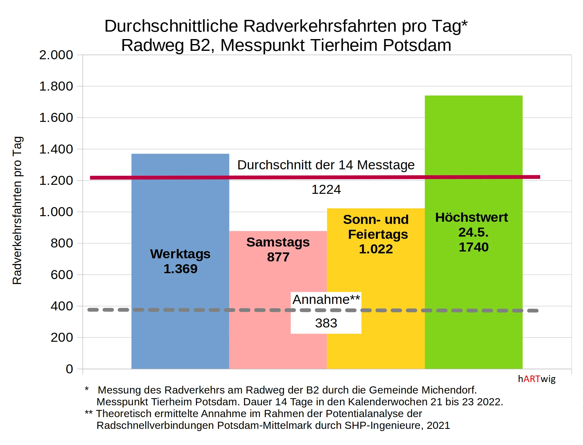 Die Gemeinde Michendorf hat in den Kalenderwochen 21 bis 23 an 14 Tagen eine Radverkehrszählung an der B2 in der Höhe des Tierheimes Potsdam durchgeführt. Im Rahmen der Radverkehrszählung wurden Werktags 1.369 Radverkehrsfahrten gezählt. Fast das Vierfache von dem, was laut der Machbarkeitsstudie zu den Radschnellverbindungen in Potsdam bisher theoretisch angenommen wurde (383 RV-Fahrten pro Tag). Auch zeigt der Verlauf der Radverkehrs-Fahrten über den Tag und die Woche, dass es sich um eine Pendler-Strecke handelt, deren Spitzenlast bei über 180 RV-Fahrten pro Stunde liegt. Der Höchstwert pro Tag lag bei 1.740 RV-Fahrten.
