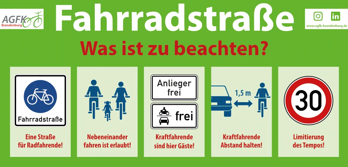 Die AGFK Brandenburg wird ihren Mitgliedern demnächst Bauzaunbanner zur Verfügung stellen, die den Bürger*innen das korrekte Verhalten auf Fahrradstraßen verdeutlichen. Zudem soll diese Aktion eine weitere Verbreitung von Fahrradstraßen in den Mitgliedskommunen befördern. In den folgenden Bildern sind das Layout des Banners sowie eine kürzlich freigegebene Fahrradstraße in der Landeshauptstadt Potsdam zu sehen. Darüber hinaus bekommen die Mitglieder Banner mit den Motiven der dritten Serie der AGFK-Kampagne ,Verkehrssicherheit – Pro Radverkehr!‘. Bisher sind diese auf Busheckflächen von vier Verkehrsunternehmen im Land unterwegs.