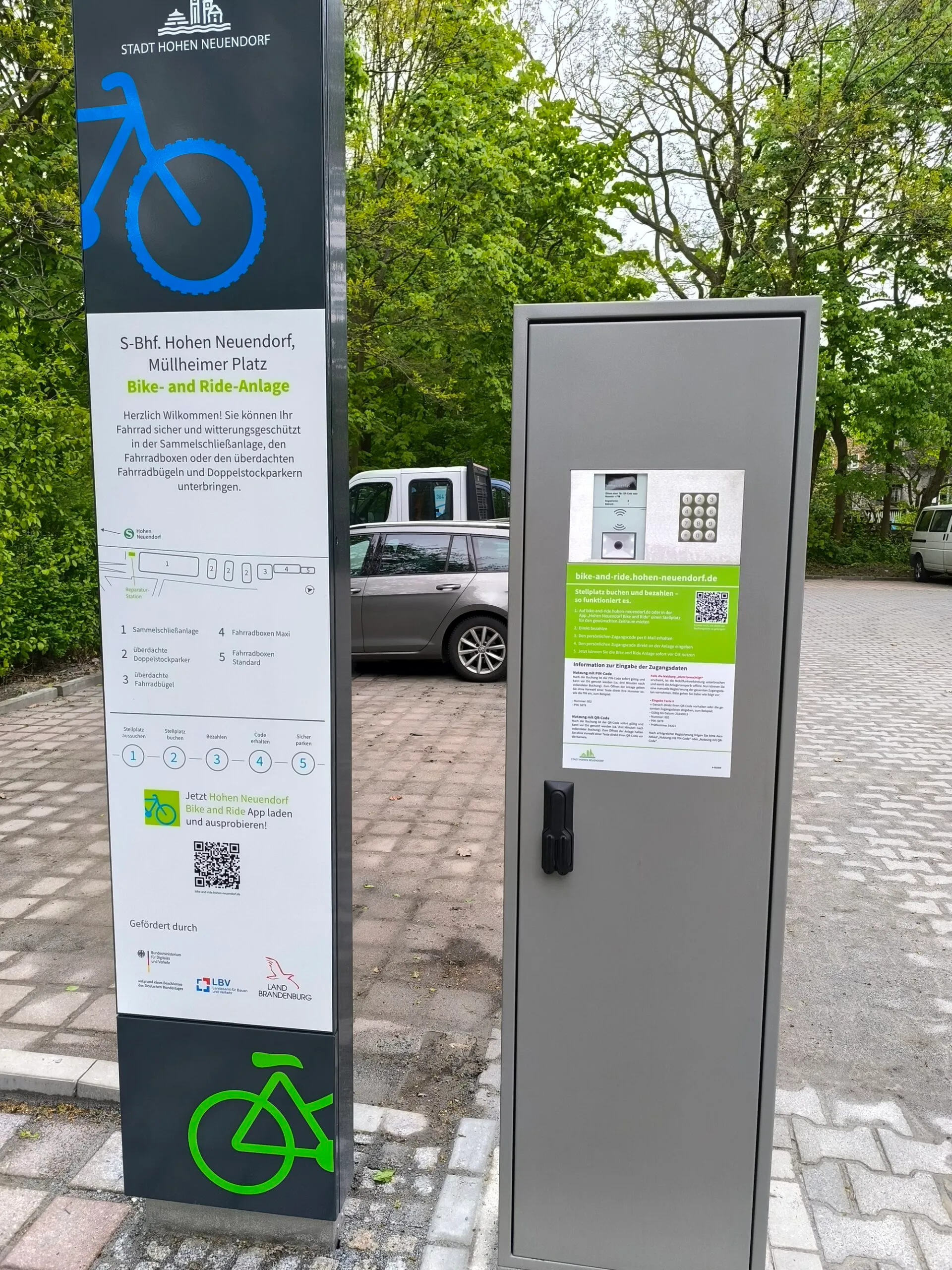 Eine Neuerung der Fahrradabstellanlage ist die Möglichkeit, einen Stellplatz für die Sammelschließanlage oder für eine Fahrradbox buchen zu können. Die Buchung erfolgt über die BikeboxHN-Internetseite https://bike-and-ride.hohen-neuendorf.de/ oder die App „Hohen Neuendorf bike and ride“.