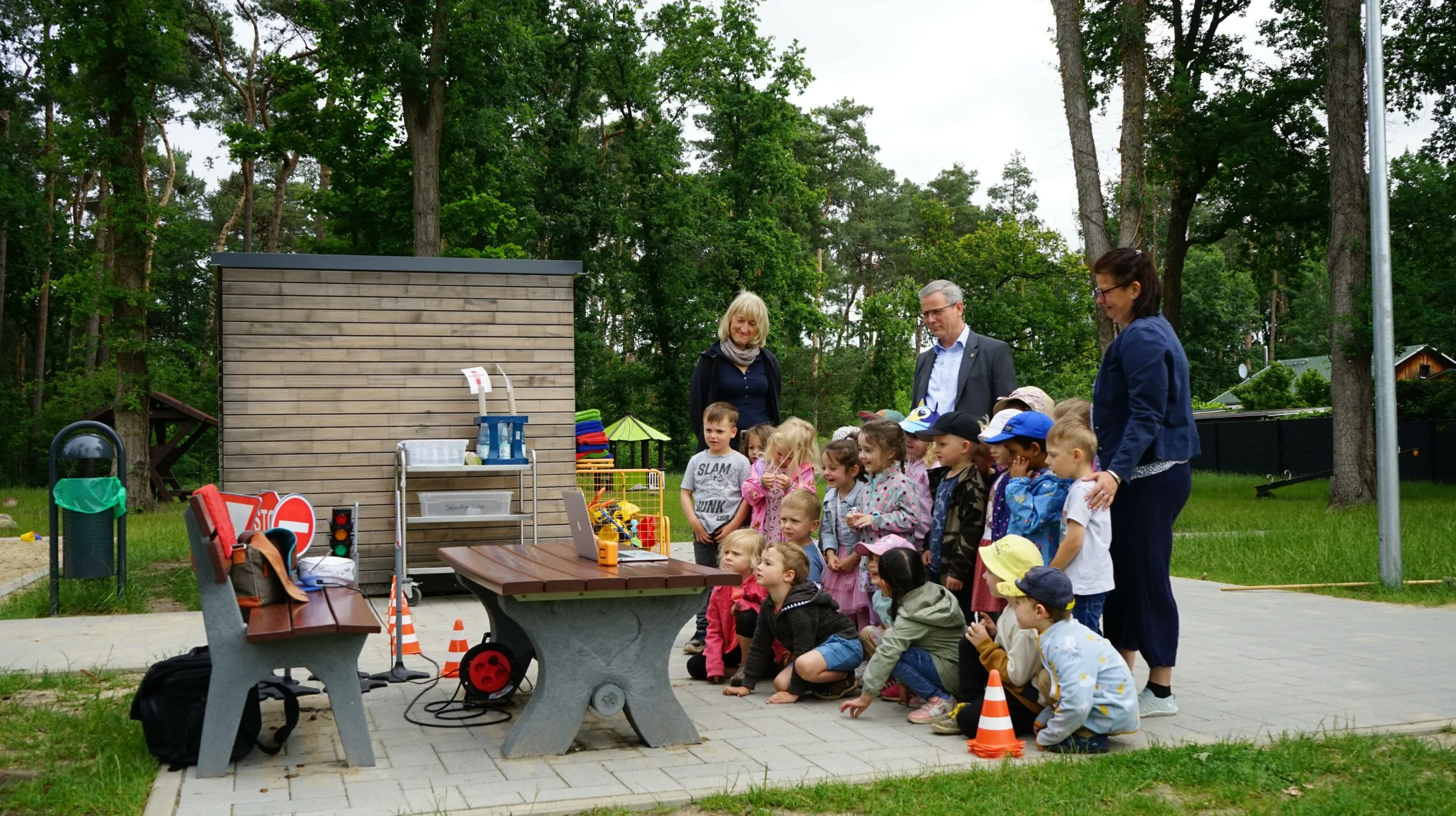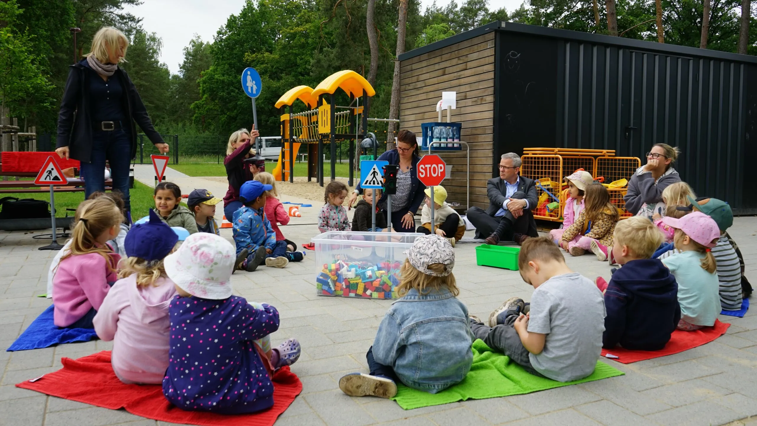 In der Ludwigsfelder Kita Fuchsberge traf sich Bürgermeister Andreas Igel mit einer Kleinkindergruppe im Alter von 3 bis 4 Jahren zu einem Radverkehrsprojekt. Der Einspielung des Erklärfilms der AGFK BB folgte eine kleine Gesprächsrunde, in der wichtige Verkehrsschilder gezeigt, die Bedeutung der Ampelfarben erklärt sowie die Nutzung von Geh- und Radwegen thematisiert wurden.