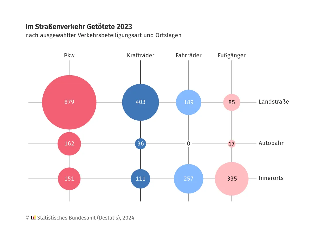 Mit fast 70 % ereigneten sich 2023 damit die meisten Unfälle mit Personenschaden innerhalb von Ortschaften. Auf Landstraßen entfielen rund 24 % und auf Autobahnen knapp 7 % dieser Unfälle. Allerdings haben Unfälle auf Straßen außerhalb von Ortschaften unter anderem wegen der höheren Fahrgeschwindigkeiten oft schlimmere Folgen als auf Straßen innerorts. Auf Landstraßen kommen weitere Risikofaktoren wie die fehlende Trennung zum Gegenverkehr, schlechte Überholmöglichkeiten oder ungeschützte Hindernisse wie Bäume neben der Fahrbahn hinzu. Dies zeigt auch die Zahl der Verkehrstoten: Innerorts kamen nahezu 32 % der bei Unfällen im Straßenverkehr Getöteten ums Leben, auf Landstraßen waren es knapp 58 % und auf Autobahnen knapp 11 %.
