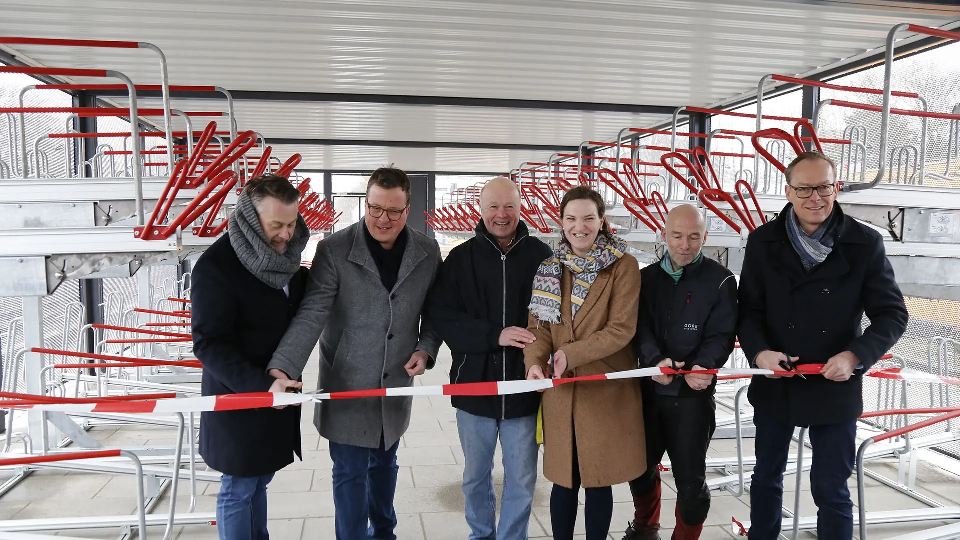 Bürgermeister Ivica Lukanic, Ratsvorsitzender Jan Schröder, Bauausschussvorsitzender Gerhard Kanter, Radverkehrsbeauftragte Valerie Agartir, ADFC-Vorstand Thilo Neumann und Baudezernent Klaus Benscheidt eröffnen im Februar 2023 das Fahrradparkhaus am Bahnhof (Foto: Stadt Wolfenbüttel)