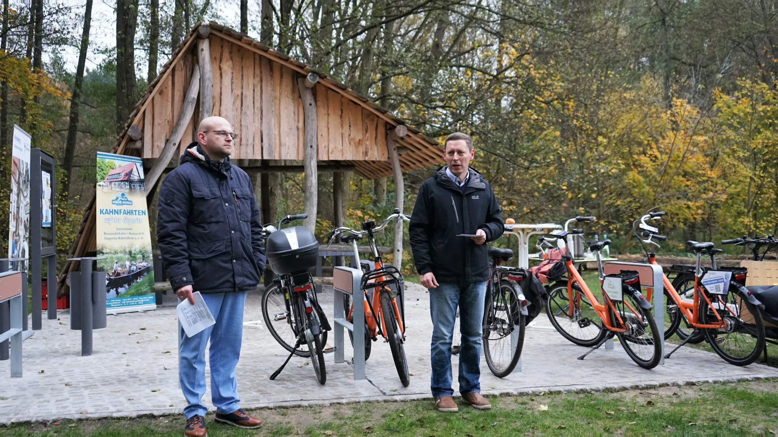 Landrat Christian Müller und Bürgermeister Axel Schmidt nehmen im November 2022 einen Fahrradrastplatz in Betrieb (Foto: Torsten Wolter, AGFK BB)