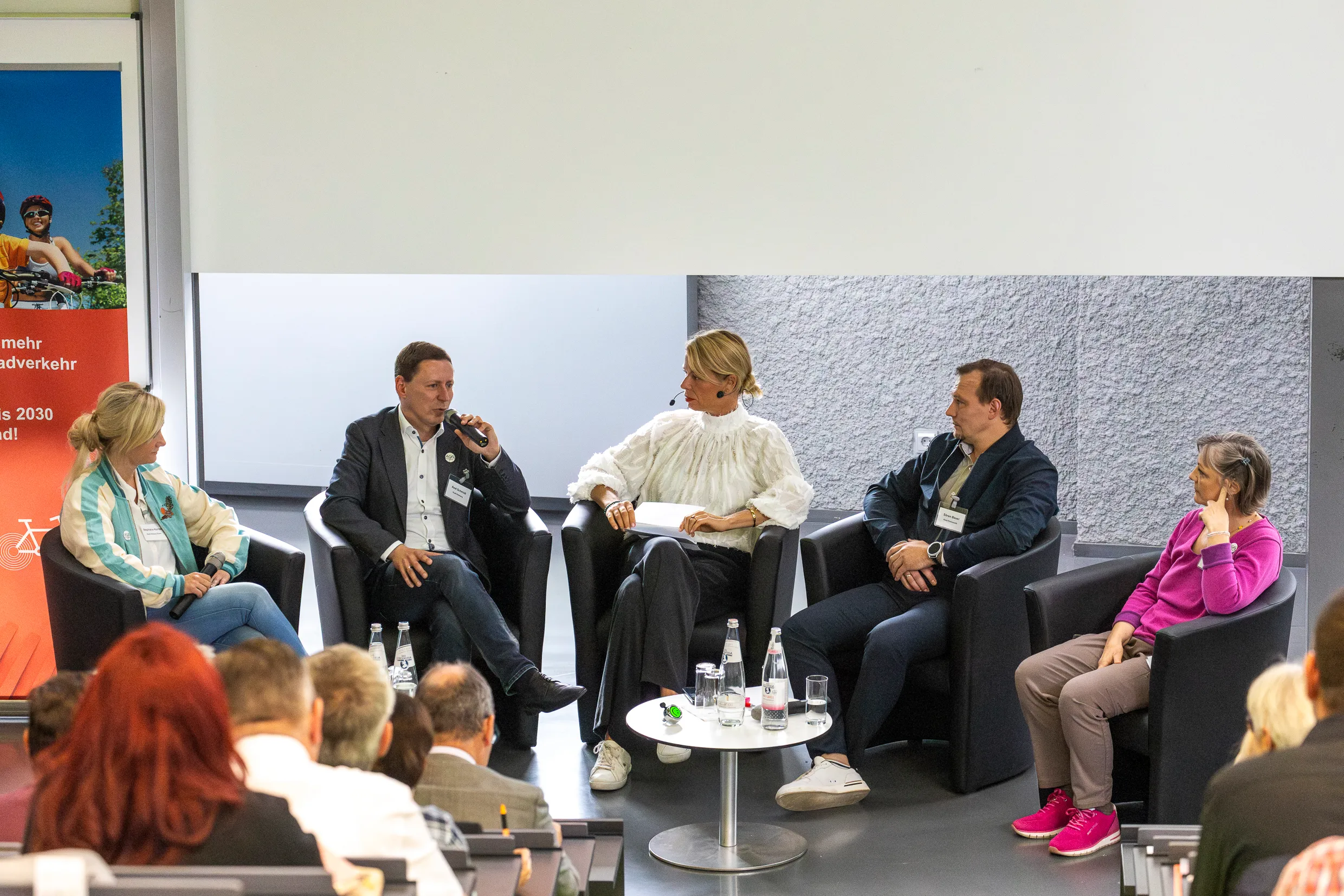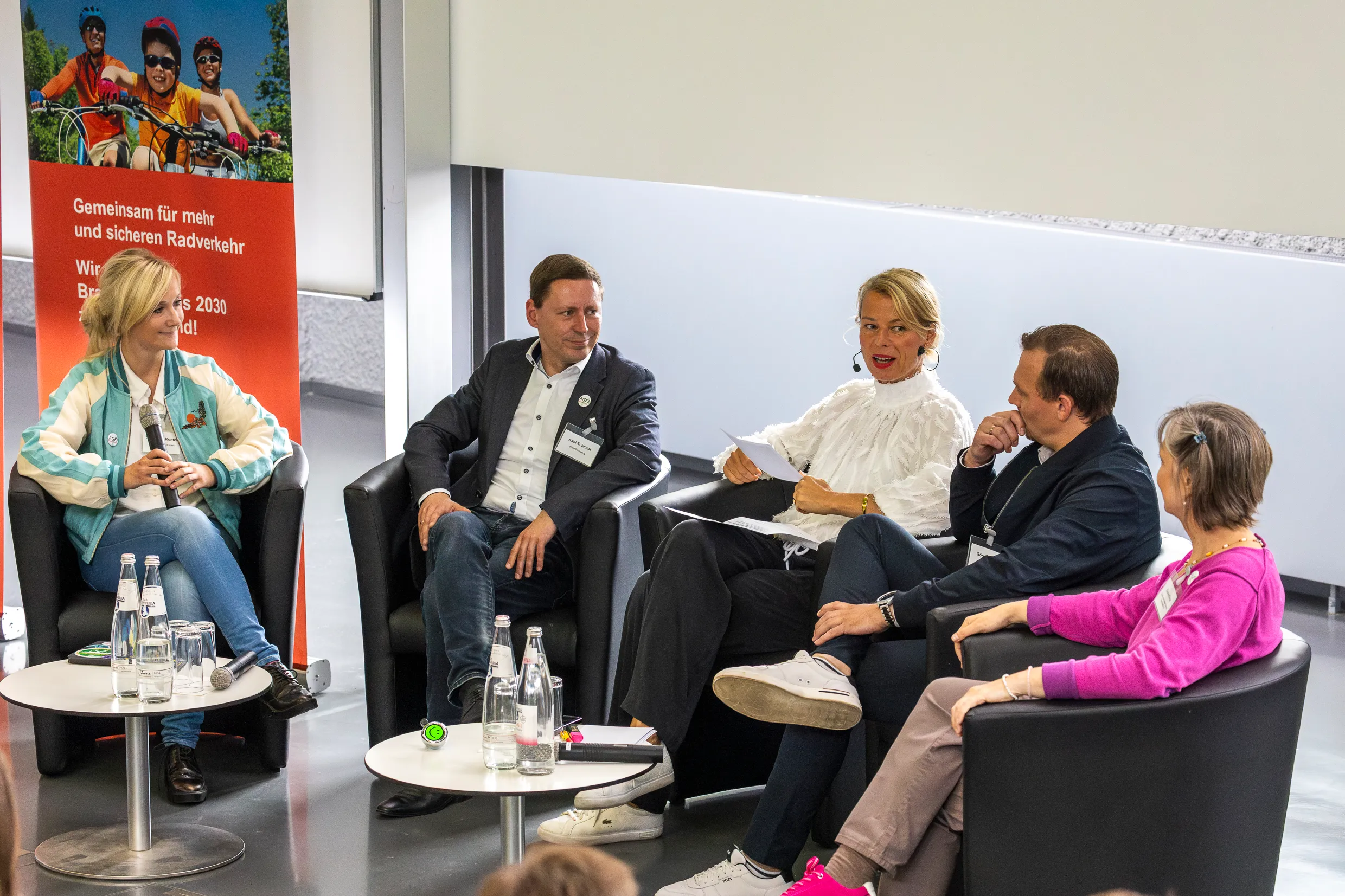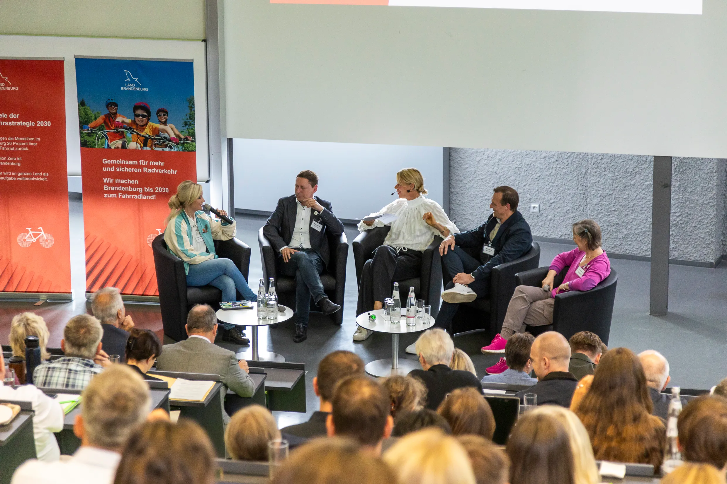 Moderatorin Ulrike Fink diskutierte am Vormittag im Plenum mit Stephanie Kuntze (Stellvertretende Bürgermeisterin der Stadt Herzberg/Elster), Axel Schmidt (Bürgermeister der Stadt Perleberg), Dana Klaus (Tourismusverband Dahme-Seenland) und Sören Bauer (Stadt Eberswalde) die Fragestellungen Was zeichnet eine fahrradfreundliche Kommune aus? und Wie kann eine nachhaltige Vernetzung gelingen? Dabei wurde deutlich, dass die AGFK BB in den zehn Jahren bereits viel erreicht hat und zielstrebig an der weiteren Entwicklung dieser wertschöpfenden kommunalen Kooperation arbeitet.