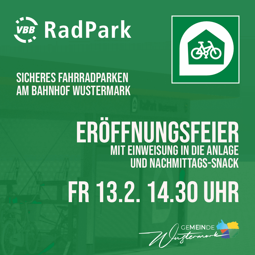 Die Eröffnung des VBB-RadParks Wustermark findet am Freitag, 13. Februar 2026, um 14:30 Uhr am Bahnhof Wustermark (östlicher Bahnsteigzugang) statt. Interessierte haben die Möglichkeit, sich vor Ort über die neue Anlage zu informieren.