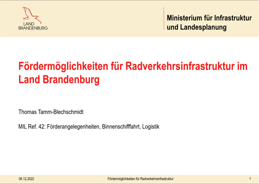 Im Radverkehrsseminar der AGFK BB im Juni 2024 zeigten Thomas Tamm-Blechschmidt und Carsten Dörnbrack (Landesamt für Bauen und Verkehr) den aktuellen Stand der Fördermöglichkeiten: