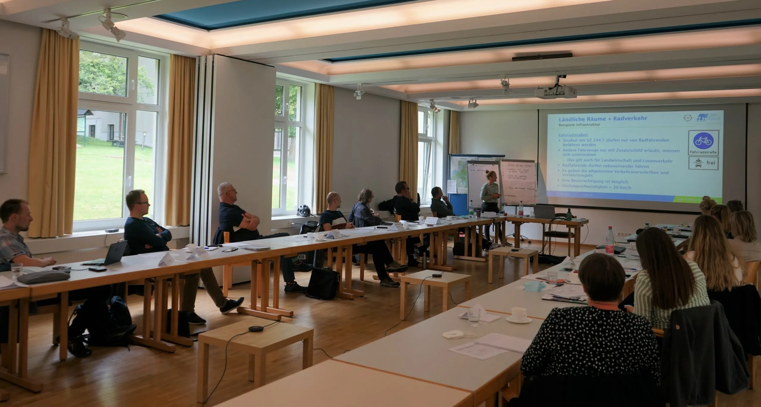 Dieses Seminar wurde in der Heimvolkshochschule am Seddiner See durchgeführt. Während der drei Tage erhielten die 16 Teilnehmerinnen und Teilnehmer eine Vielzahl an thematischen Inputs wie z. B. zu den Grundlagen des Radverkehrs, zu rechtlichen Begriffen, welche Fördermöglichkeiten in Brandenburg vorhanden sind und was eine erfolgreiche Öffentlichkeitsarbeit ausmacht. Zudem wurden Workshops zum Thema der öffentlichen Beteiligung sowie der Radverkehrsplanung angeboten. Während der Kaffee- und Essenspausen bot sich die Möglichkeit sich untereinander und mit den Expert*innen fachlich auszutauschen. Als Abschluss der Veranstaltung wurde eine gemeinsame Fahrradtour durch die Gemeinde Michendorf mit ihren Ortsteilen unternommen. Hier konnten die vermittelten Kenntnisse anhand der Praxisbeispiele veranschaulicht und diskutiert werden.